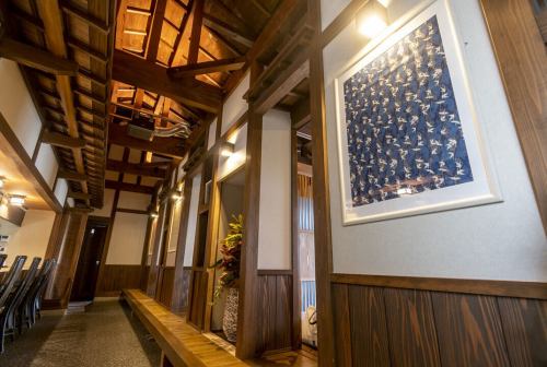 古民家を再生した趣ある建物は、吹き抜けになっており天井が非常に高く開放感あふれる空間が広がっています。歴史を感じさせる梁や柱が醸し出す和の情緒と、モダンな雰囲気が融合した内装が特徴です。また、約20台収容可能な大型駐車場も完備しておりますので、遠方からお越しの方や団体様も安心してご来店いただけます。